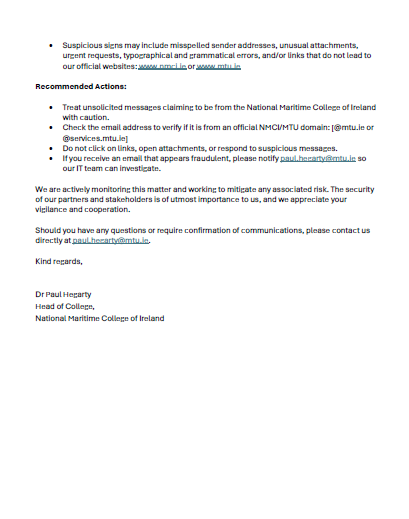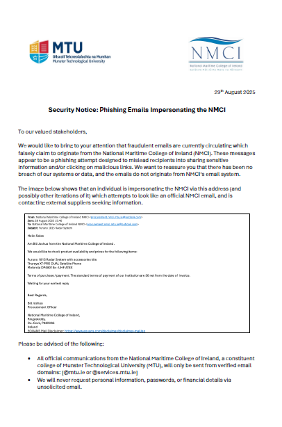 Please find below an important security notification regarding a recent phishing attempt in which it appears an external party has been impersonating the National Maritime College of Ireland.